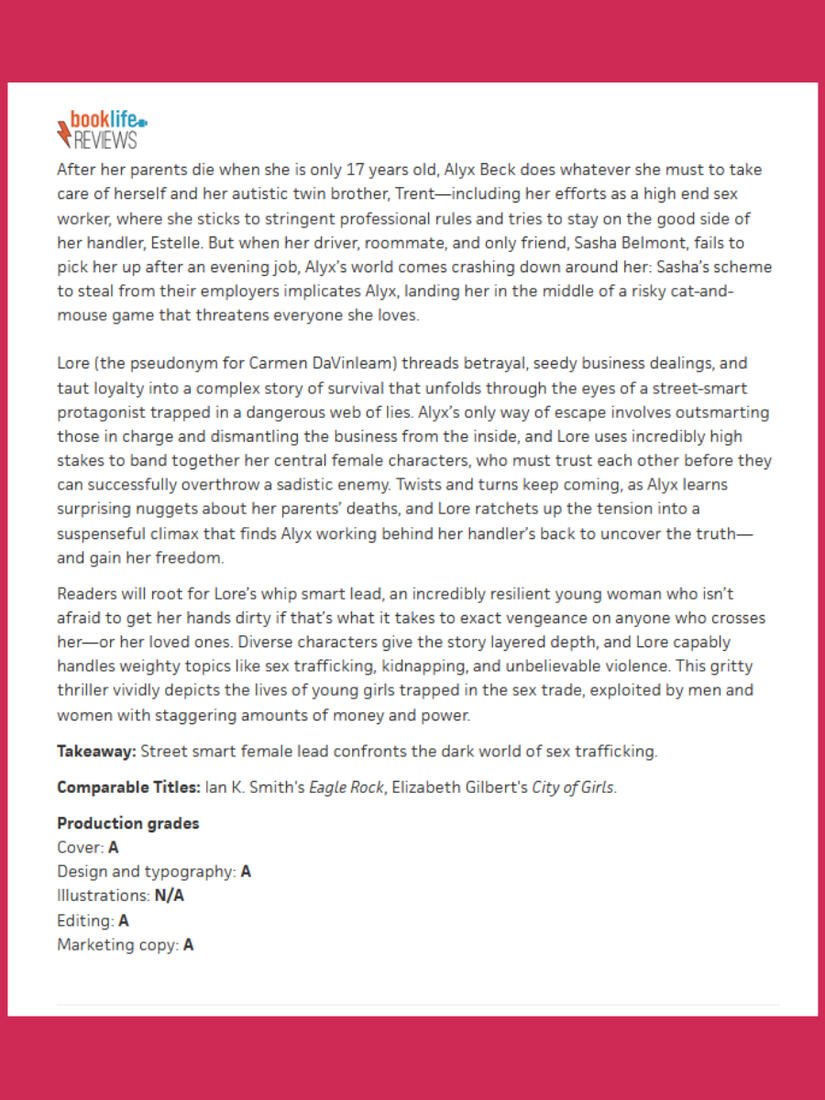 Alyx Beck has to fake it several times a day. Fake the desire, the lust, and the orgasms. What she doesn’t have to fake is her love for her neurodivergent twin brother or her allegiance to her employer. She’ll do whatever her handler requires of her. They’ve taken care of her since her parents died tragically, and they’ve never steered her wrong. They pay her well so she can take care of her brother’s needs, too. However, when Alyx’s driver/bodyguard—and only friend— Sasha, goes missing with $100K, her devotion can no longer shield her from the handler’s wrath. As events spiral Alyx realizes—a little too late—that she’s been backing the wrong people. She’s caught in a sticky web and there’s only one way out— she’ll have to get a little blood on her hands. Sometimes for the fly to survive it must kill the spider.