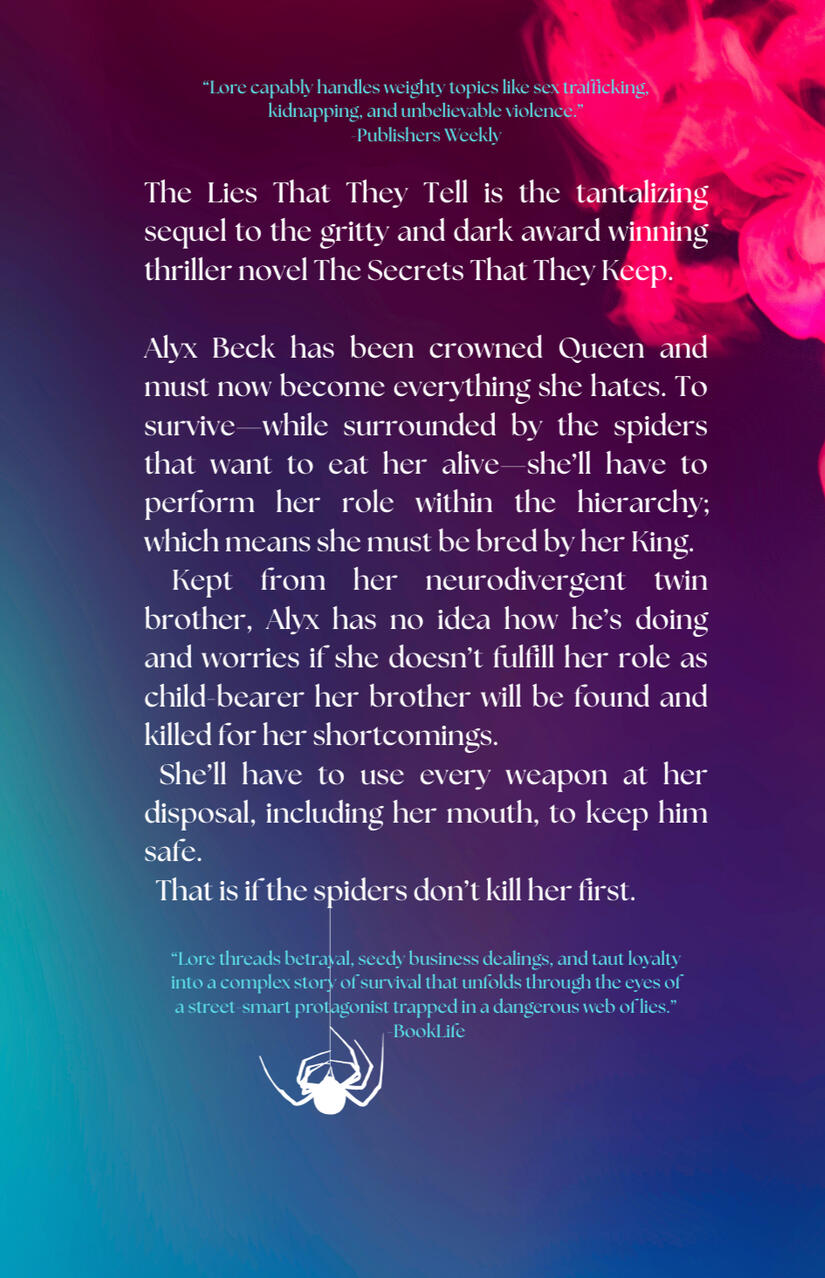Alyx Beck has to fake it several times a day. Fake the desire, the lust, and the orgasms. What she doesn’t have to fake is her love for her neurodivergent twin brother or her allegiance to her employer. She’ll do whatever her handler requires of her. They’ve taken care of her since her parents died tragically, and they’ve never steered her wrong. They pay her well so she can take care of her brother’s needs, too. However, when Alyx’s driver/bodyguard—and only friend— Sasha, goes missing with $100K, her devotion can no longer shield her from the handler’s wrath. As events spiral Alyx realizes—a little too late—that she’s been backing the wrong people. She’s caught in a sticky web and there’s only one way out— she’ll have to get a little blood on her hands. Sometimes for the fly to survive it must kill the spider.